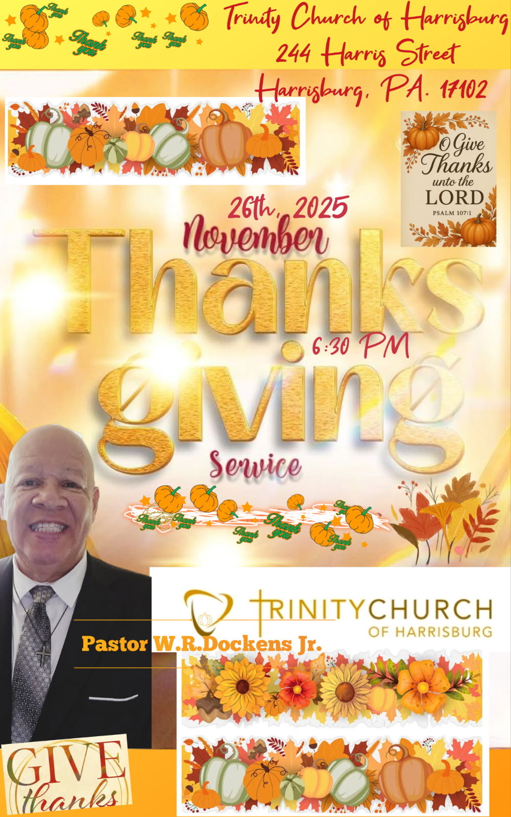 Trinity Church of Harrisburg, under the tutelage of Pastor Walter R. Dockens, Jr. has continued increase in congregation, have five (5) preaching Elders, four (4) Deaconesses, four (4) Deacons and a Deacon-in-training, placed a Hispanic congregation in the old bethel and purchased a new bethel. The ministry of saving souls, serving the Lord and reaching out to the community has also continued.